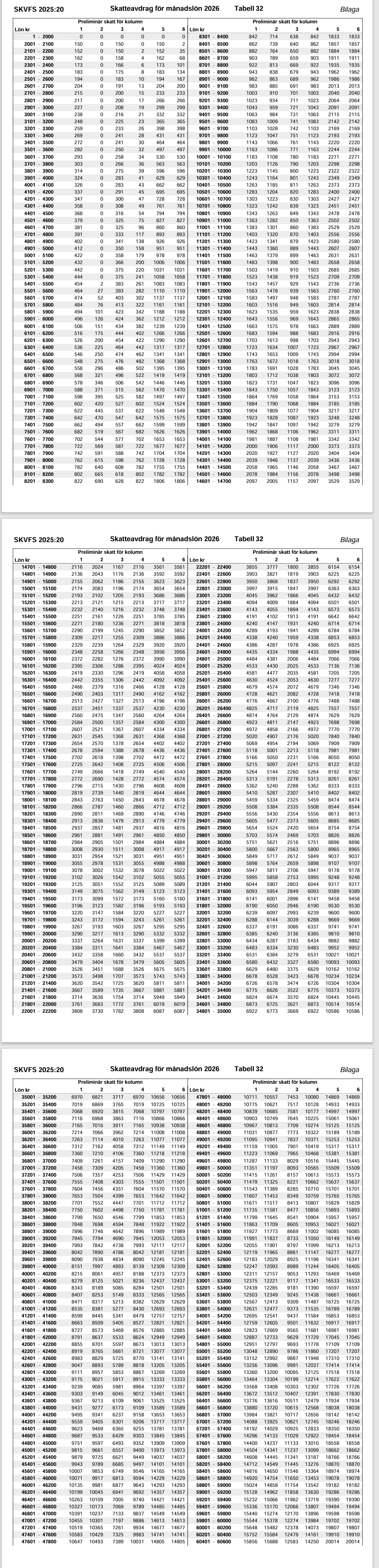 Skattetabell 32 för år 2026 i Sverige.